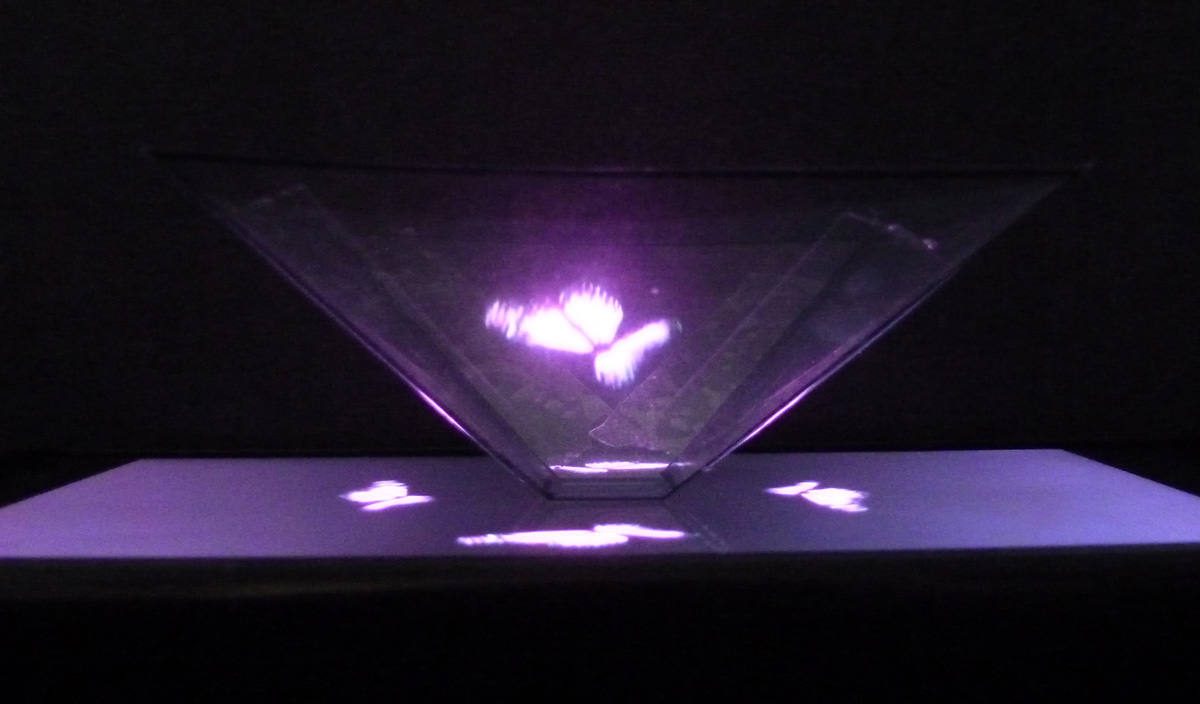 Besonders schön daran ist, dass sich jeder mit Smartphone und einfacher Overheadfolie ein solches „Hologramm“ selbst direkt und in live anschauen kann. Einfach eine Pyramide aus Overheadfolie bauen, aufs Smartphone sezen, entsprechendes Video aufrufen und staunen!