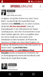 Mein lieber Herr Müller-Michaelis, für die Behauptung, dass Pizza-Services in den USA am Super Bowl Sonntag ein Drittel ihres Jahresumsatzes machen, hätte ich mal gerne eine Quelle. Mit etwas Nachdenken sollte hier jeder Journalist bemerken, dass da sehr wahrscheinlich was nicht stimmen kann.