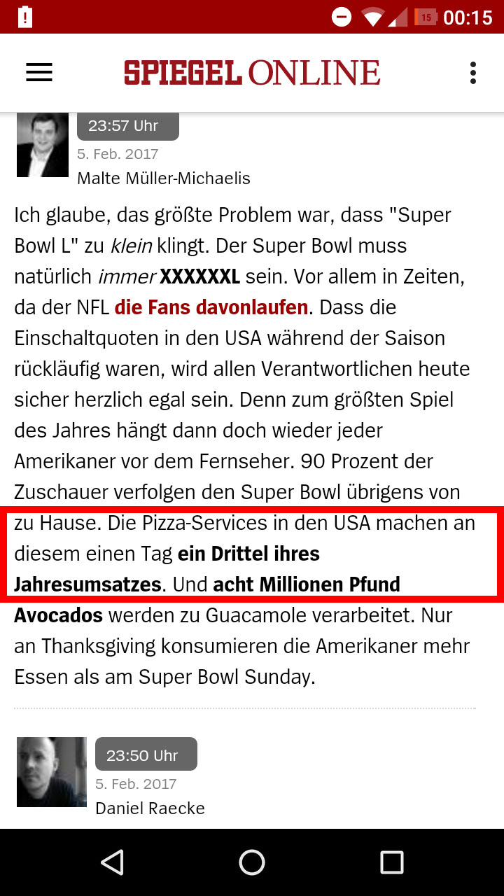 Mein lieber Herr Müller-Michaelis, für die Behauptung, dass Pizza-Services in den USA am Super Bowl Sonntag ein Drittel ihres Jahresumsatzes machen, hätte ich mal gerne eine Quelle. Mit etwas Nachdenken sollte hier jeder Journalist bemerken, dass da sehr wahrscheinlich was nicht stimmen kann.