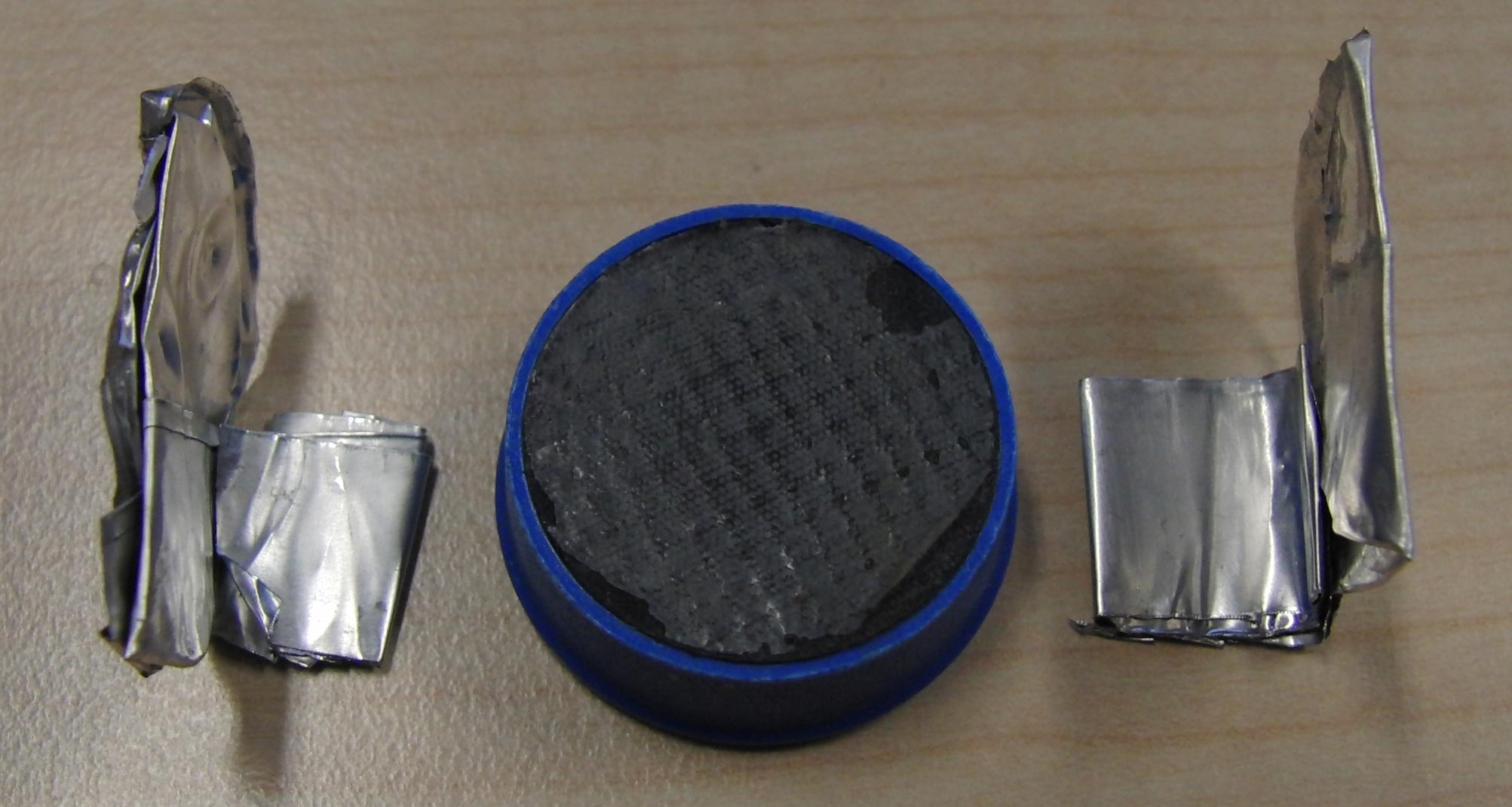 Als erstes stellt man dann die Pumpeneinheit her. Dazu werden die Teelichtschalen aufgeschnitten und zu Elektroden gebogen. Diese sollten am Ende etwa so aussehen wie in folgendem Bild: