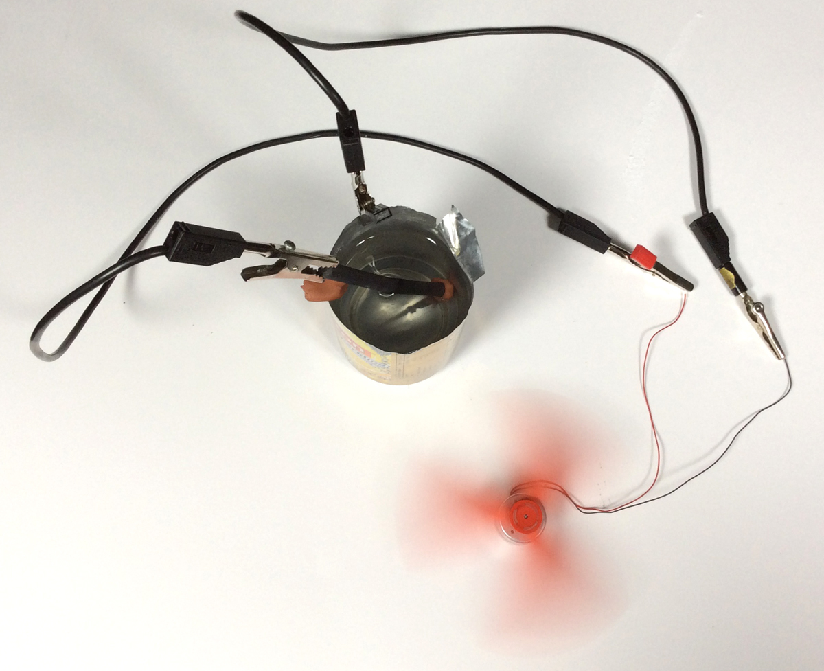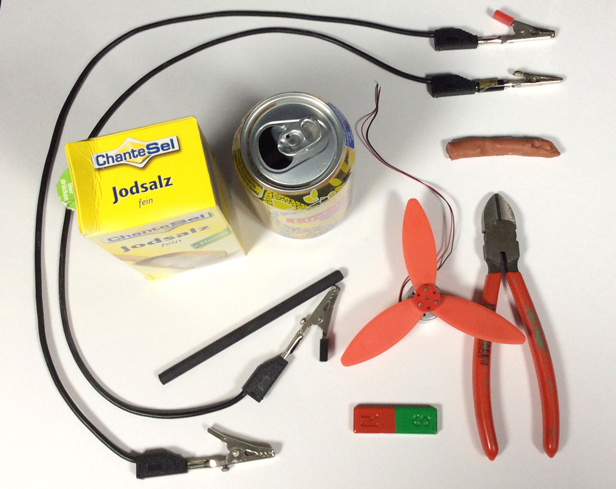 Durchführung: Die Salzwasserlösung in die Dose füllen und den Dosenrand (Minus-Pol) mit Klemmen und Kabel an den Motor anschließen. Nun den vorbereiteten Kohlestab (Plus-Pol) ins Salzwasser in der Dose geben und das Kabel ebenfalls mit dem Motor verbinden.